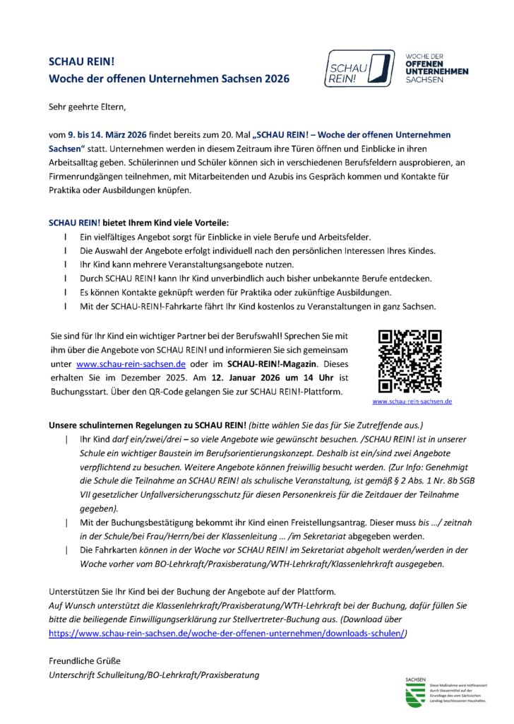 Mit Hilfe dieser Vorlage können Sie einen schuleigenen Elternbrief verfassen, der auf SCHAU REIN! hinweist und alle schulinternen Regelungen zu SCHAU REIN! enthält. Die kursiv geschriebenen Textstellen können Sie je nach Bedarf auswählen und anpassen.